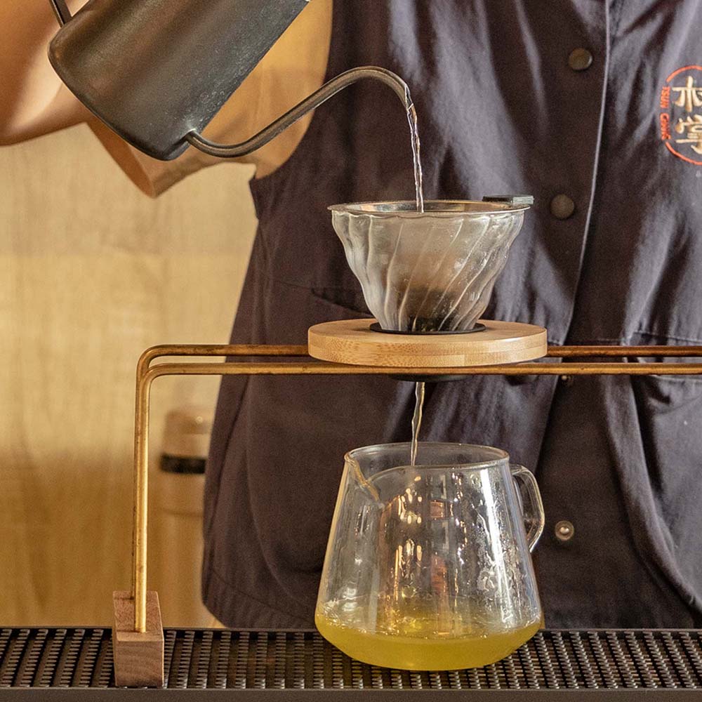 改變以往茶飲店桶泡模式,以手沖茶職人形態應用在每一杯茶飲,透過每杯現沖、手沖方式同時滿足視覺、嗅覺、味覺的享受,擁有近手搖飲的製茶速度,亦具備壺泡茶的風味,使茶得以展現它最迷人的風味。